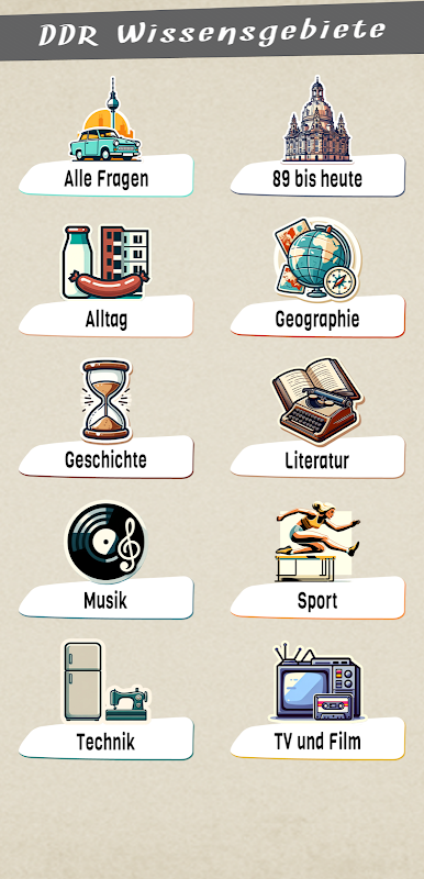آپ GDR کو کتنی اچھی طرح جانتے ہیں؟ DDR کوئز میں اپنے علم کو دکھائیں اور بڑھائیں۔ 500+ سوالات مختلف زمروں سے آپ کے منتظر ہیں، جیسے روزمرہ کی زندگی، جغرافیہ، فلم اور ٹیلی ویژن، تاریخ، موسیقی، ٹیکنالوجی، کھیل اور بہت کچھ۔ یہ آپ پر منحصر ہے کہ آیا آپ چاہتے ہیں کہ آپ کے علم کی جانچ صرف مخصوص زمروں میں کی جائے یا آپ تمام سوالات کے رنگین آمیزہ جواب دینا پسند کریں گے۔