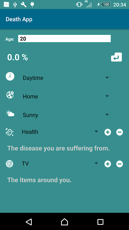 This is a death probability calculator, first set the age and then select the time, place, weather and suffering from the disease, and then selected around the items of general life, and finally calculate the probability of death.(Please choose all and then calculate)
