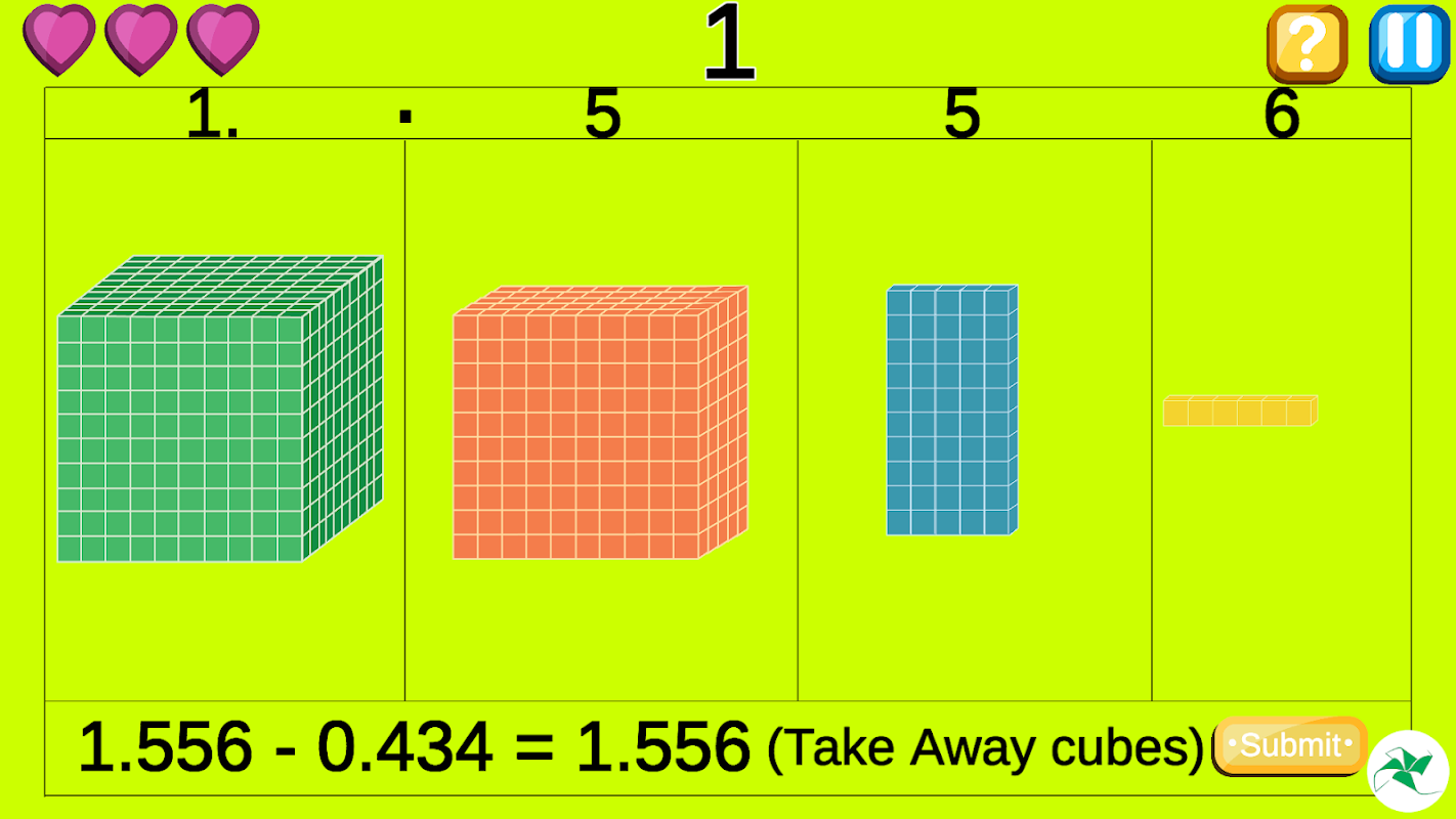 One whole is made of 1000 cubes. This is divided into tenths, hundredths and thousandths parts. Children play with this part to understand relationship between decimals numbers like .2,.02, .002. Gradually children are able to visualize the whole when only part is given.