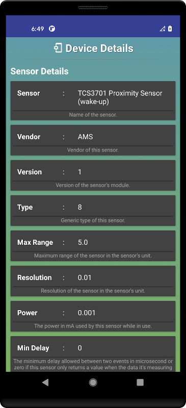 ڈیوائس کی تفصیلات - ڈیوائس انفارمیشن ایک طاقتور لیکن آسان ایپ ہے جو آپ کو اپنے فون کے بارے میں تمام ضروری تفصیلات سے آگاہ کرتی ہے۔ چاہے یہ آپ کے سسٹم آن چپ (ایس او سی) سے متعلق معلومات ہو ، آپ کے آلے کی میموری ہو یا آپ کی بیٹری کے بارے میں ٹیک چشمی ہو یا آپ کے آلے کے سینسرز کے بارے میں تمام متعلقہ معلومات۔ ڈیوائس کی تفصیلات - ڈیوائس کی معلومات اس سب کے ل Info آپ کا ایک مقام ہے۔ تمام سافٹ ویئر اور ہارڈ ویئر کی تفصیلات کی مکمل فہرست۔