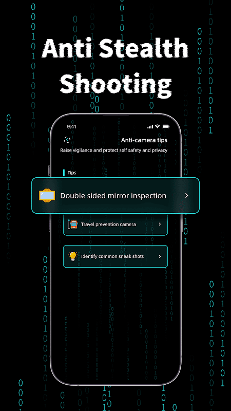 جب آپ کسی ہوٹل میں سفر کرتے ہیں، گھر میں قیام کرتے ہیں، یا نئے گھر میں جاتے ہیں، تو آپ پریشان ہوتے ہیں کہ ہوٹل کے کمرے، باتھ روم اور دیگر نجی جگہوں پر کیمرہ نصب ہے۔ ڈیوائس ڈیٹیکٹر کے ذریعے، آپ کیمرہ کے مشکوک آلات کا فوری پتہ لگا سکتے ہیں، اور چوری کو روک سکتے ہیں، جو آپ کی ذاتی رازداری کے تحفظ کے لیے ضروری سافٹ ویئر ہے۔