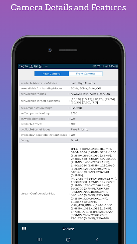 Processor, CPU, RAM, Storage, Camera, Battery, Network, WiFi, SIM, Bluetooth, Display, Screen resolution, GPS, NFC, USB, Sensor, Microphone, Root, Bootloader, CDMA, GSM, Fingerprint, VOIP, Audio & Video Support info, Camera Scene Modes, Camera frame & Resolution, orientation, Bloatware, Default apps, System app, User installed apps, Mac address, SSID, Link speed, IP address, OTG device info, Battery voltage, Battery health, Battery type, OS version, Board, Manufacturer, Model number