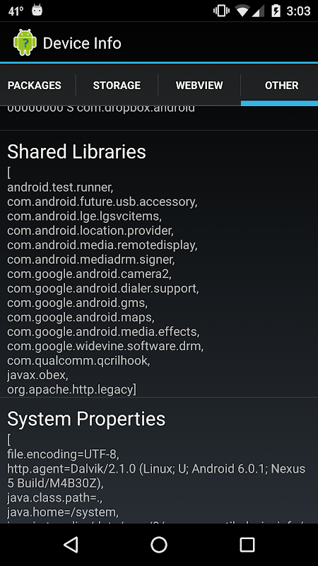 A very simple and small utility that displays various tidbits of information about the device WITHOUT needing any special permissions. Can be useful for developers to quickly determine device metrics or for people who are just curious about the type of device they have. Information displayed: