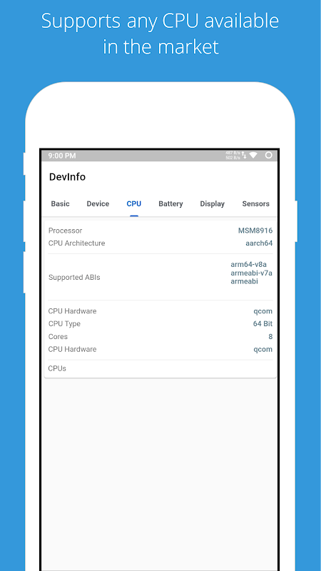 ✔ سسٹم: سی پی یو فن تعمیر ، بورڈ ، کورز کی تعداد ، گھڑی کی رفتار ، سی پی یو کی خصوصیات ، گورنر ، اور دانا کی معلومات۔