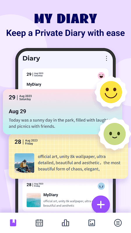 ✨DiaryTime✨ ایک روزمرہ کی ڈائری ایپ ہے جس میں تالا لگا ہوتا ہے۔ آپ اس نجی جریدے کی ایپ کو روزانہ کے واقعات ریکارڈ کرنے، موڈ کیپچر کرنے اور جذبات کو ٹریک کرنے کے لیے استعمال کر سکتے ہیں۔ ساتھ ہی، یہ مفت ڈائری ایپ آپ کے کسی بھی نجی جریدے کو لاک کر سکتی ہے، راز افشا ہونے کی فکر نہ کریں۔