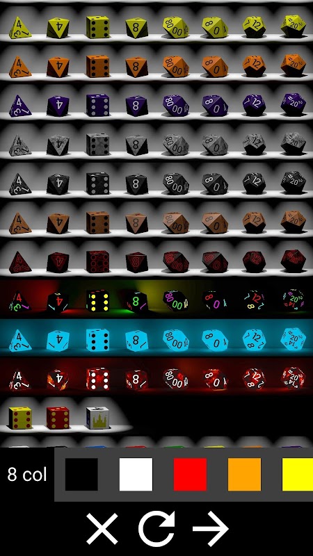 - نرد کی اقسام: D4 ، D8 نمبر 1-4 ، D6 کے ساتھ D6 ، D6 نمبروں کے ساتھ ، D8 ، D10 (سیکڑوں) ، D10 (ایک) ، D12 ، D20 ، اور D30۔