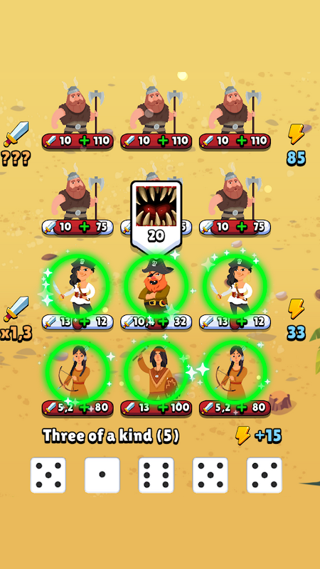 In Dice Attack: Battle Roll Game, the outcome hinges on the roll of the dice. Strive to achieve the best combination from five dice to obtain attack points. Utilize these points to unleash a barrage of devastating attacks. The battlefield will tremble as you slice n dice your way to victory! 💥🎲🔥