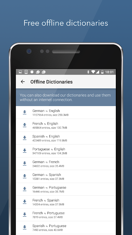 These dictionaries are also available without Internet. You will find reliable translations in the shortest time, even when you're offline.