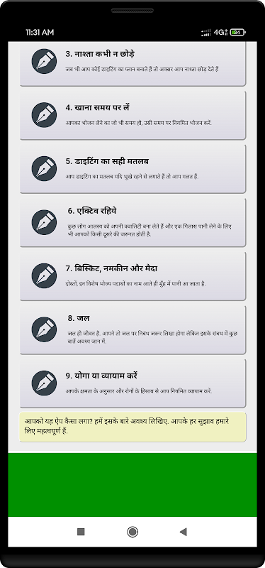ہندی میں ایپ پیش کرنا کہ پرہیز کا منصوبہ کیسے بنایا جائے۔ اس میں بہت سے نئے آئیڈیاز شامل ہیں جو آپ کو اچھی صحت ، آپ کے جسم کی بہتر شکل اور اچھی شکل حاصل کرنے میں مدد دے سکتے ہیں۔