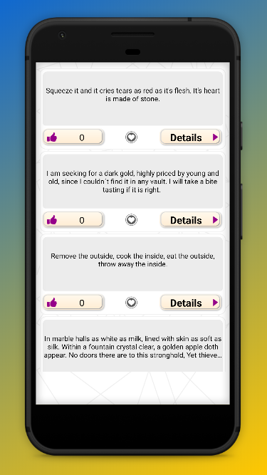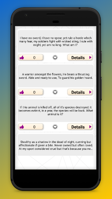 In our difficult riddles app you’ll find easy and little riddles,hard riddles to solve,funful and hard riddles to ask people,riddles to ask friends,riddles to solve,riddles to survive,smart riddles to ask people,hard and most difficult riddles to ask people and test your brain,riddles to make everyday funful etc and various types of intelligent riddles. By following our riddles app you can turn any boring situation into a friendly environment. If you are tired of the monotonous and boring routine of life due to extra work pressure,our difficult riddles app will be a help for you. It will help you turn any not friendly environment to an interesting and competitive ambience. Our riddles will also help you do brain storming. If you like our app then please share it with your friends and family to also let them know about the brain storming riddles.