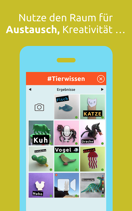 ► میڈیا قابلیت کی تربیت: بچے ایپ کے ذریعہ عمر کے لحاظ سے مناسب میڈیا ٹریننگ حاصل کرتے ہیں ، جس میں وہ اسمارٹ فون یا ٹیبلٹ کو بطور ٹول جانتے ہیں۔ اس طرح وہ فعال اور عکاس میڈیا پروڈیوسروں میں ترقی کرتے ہیں جو اپنی فنی صلاحیتوں کو اعتماد اور قابلیت کے ساتھ استعمال کرتے ہیں۔
