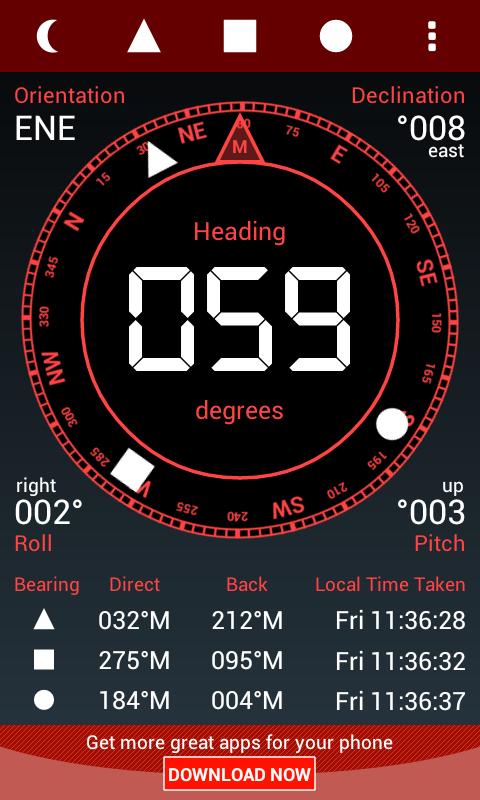 ایپ میں آپ کی سرخی ینالاگ کمپاس پر دکھاتی ہے ، ساتھ ہی ایک ڈیجیٹل سینٹر پینل بھی ڈگریوں میں آپ کی سرخی ظاہر کرتا ہے۔