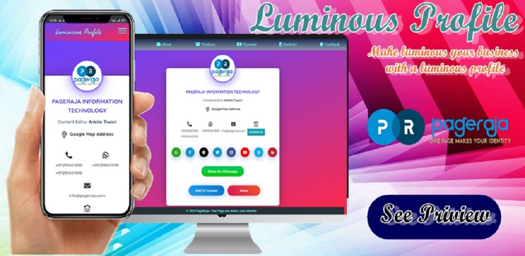 پیج راجا انٹرنیٹ پر ڈیجیٹل صفحات کے ذریعہ آپ کی ڈیجیٹل شناخت فراہم کرتا ہے۔ آپ پیجراجا پلیٹ فارم کا استعمال کرکے اپنا ڈیجیٹل کارڈ بنا سکتے ہیں اور اپنے مؤکل کو متاثر کرسکتے ہیں۔