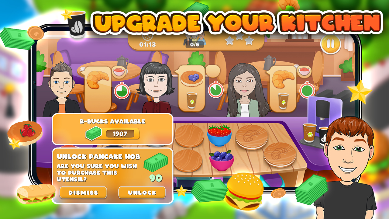 اپنے کچن میں مختلف قسم کے کھانے پکانے کے لیے اپنے ڈنر کھولیں جن میں پینکیکس ، پیزا ، برگر اور بہت کچھ شامل ہے۔ شہر میں پیش رفت ، اپنے ریستورانوں کو اپ گریڈ کرنے کے لیے اپنی خدمت کی صلاحیت کو بڑھائیں۔