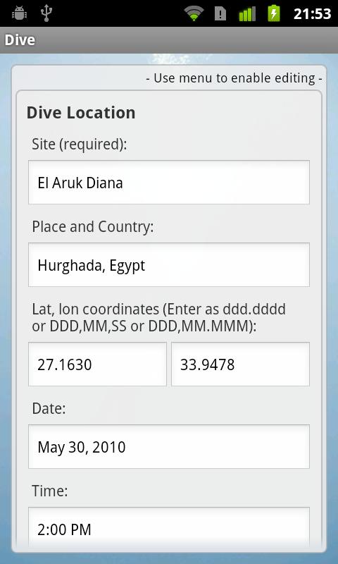 Unless specifically opened for editing (e.g. by long pressing on a dive from the dives list and selecting it from the context menu), a screen will show info in reading mode (to avoid accidental modifications). You can start editing by opening the menu and selecting the edit mode.