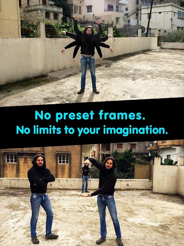 DMD Clone is a fully automated cloning camera app. No need for manual adjustments, no preset frames, just shoot, shoot, shoot, done!