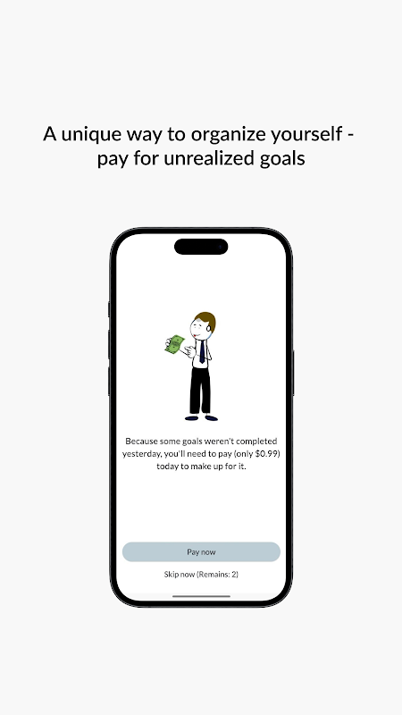 اپنے دن کو ہماری چیکنا اور بدیہی ایپ کے ساتھ تبدیل کریں جو آپ کو روزانہ کے اہداف کی فہرست بنانے اور انہیں حاصل کرنے کے لیے متحرک رہنے میں مدد دیتی ہے۔ ایک منفرد موڑ کے ساتھ جوابدہی کی طاقت کا استعمال کریں - اپنے کاموں کو مکمل کریں یا اپنے آپ کو کامیابی کے لیے آہستہ سے آگے بڑھائیں۔