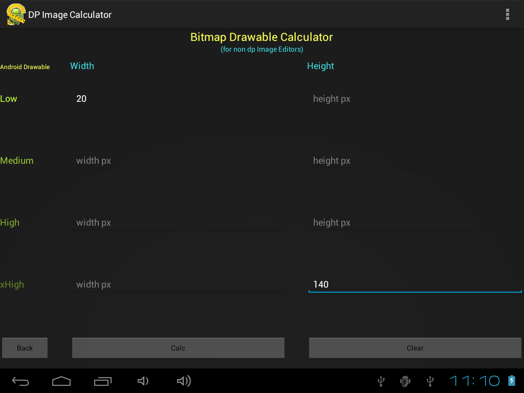 Calculate the size in pixels for your image to correspond to Density-independent Pixels for Android Developers. Simply supply a width and a height in pixels and the calculator will calculate the low (drawable-ldpi), medium (drawable-mdpi), high (drawable-hdpi) and extra-high (drawable-xhdpi) sizes. The various sized low, medium, high and xhigh will scale automatically corresponding to dp-to-pixel ratio, thereby making it easier to scale your images for Android. The application accepts a single width and height in any of the size categories, so if you have created your initial image and you want it to only be a certain height for xhdpi size, but need to only have it 20 pixels wide for the ldpi, you can put in each of those dimensions and the rest will be calculated for you.