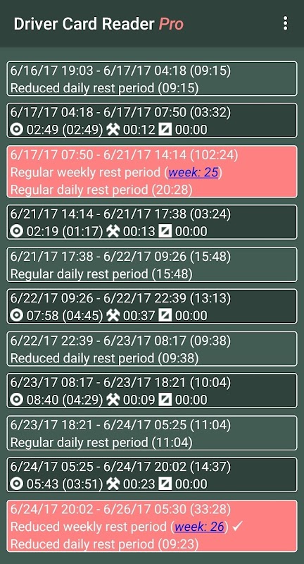 ایپلیکیشن ڈرائیور کارڈ پر موجود ڈیٹا کا تجزیہ کرتی ہے اور ڈرائیونگ اور آرام کی مدت میں ممکنہ خلاف ورزیوں کی نشاندہی کرتی ہے۔ آپ ڈرائیور کی سرگرمیوں کی تفصیلی فہرست حاصل کر سکتے ہیں۔ ہم ہفتہ وار/ماہانہ/شفٹ بریک ڈاؤن میں آپ کے کام کے وقت کا حساب کتاب تیار کریں گے۔ اس طرح، آپ اپنے آجر سے ملنے والے ورکنگ ٹائم اکاؤنٹنگ کو بھی چیک کر سکتے ہیں۔ ہم آپ کے کام / آرام کے وقت کی منصوبہ بندی کرنے میں آپ کی مدد کر سکتے ہیں۔