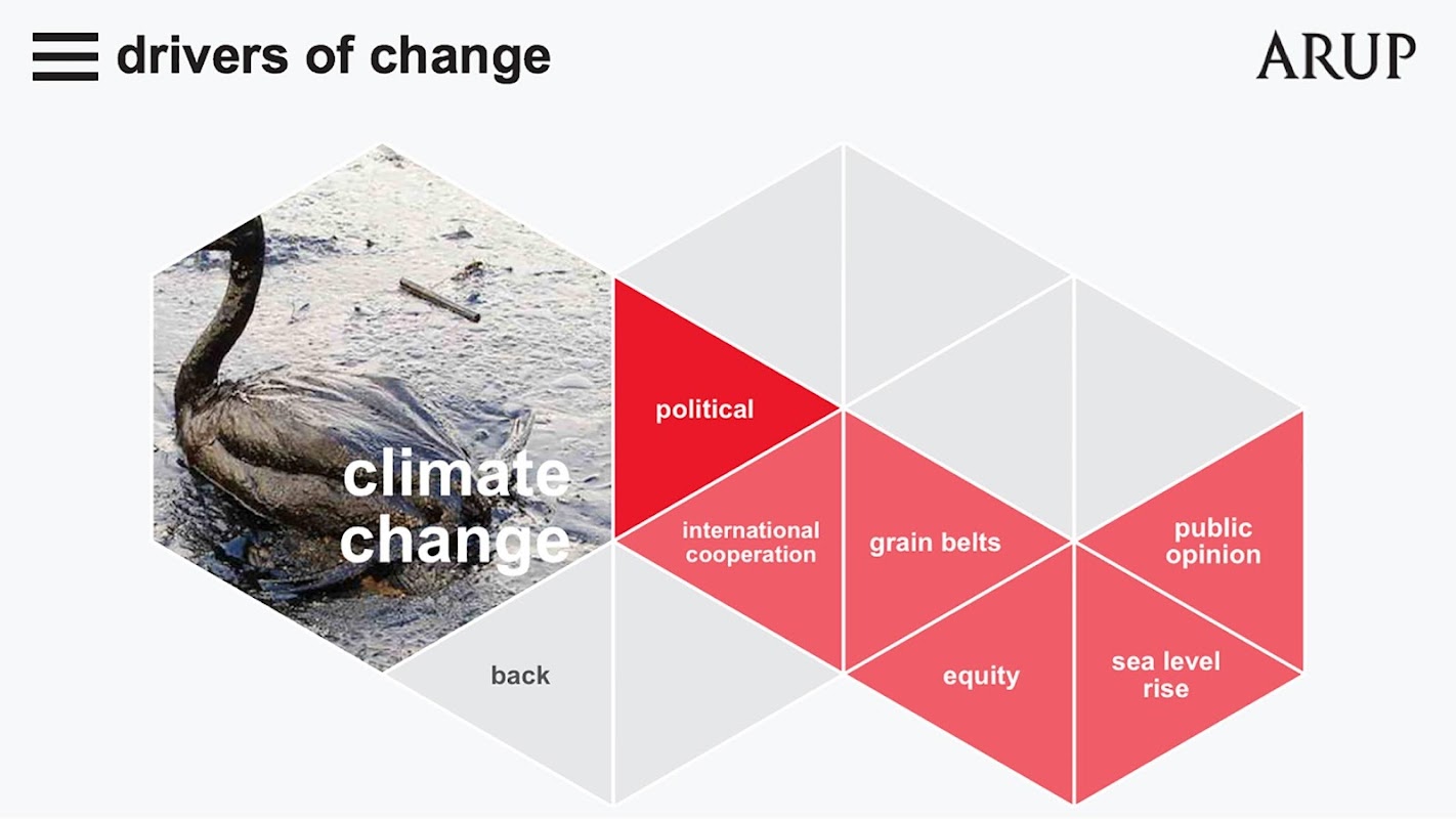 The Drivers of Change app is informed by a very rigorous process of interviews, research and workshop analysis alongside input from Arup’s global network and broad spectrum of experts.