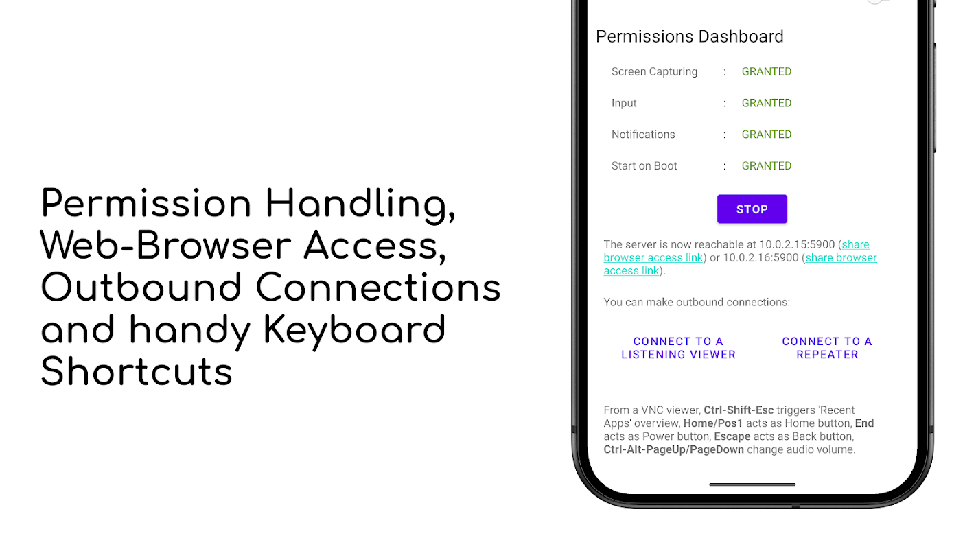 - ریموٹ کنٹرول: اپنے آلے کو کنٹرول کرنے کے لیے اپنے VNC کلائنٹ کا استعمال کریں، بشمول ماؤس اور بنیادی کی بورڈ ان پٹ۔ اسے فعال کرنے کے لیے، آپ کو اپنے آلے پر Accessibility API سروس کو چالو کرنا ہوگا۔