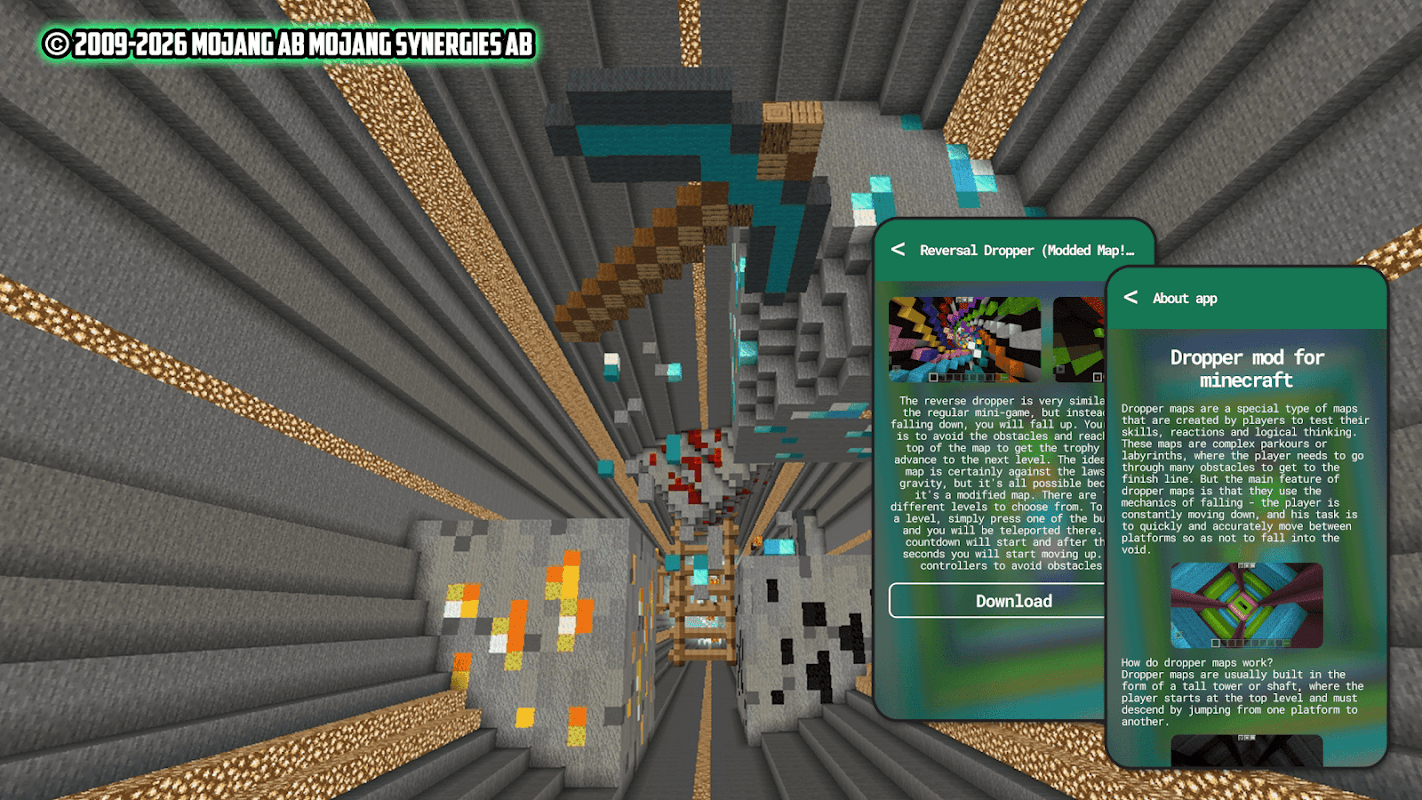 مائن کرافٹ کے لیے ڈراپر میپ میں کھلاڑیوں کو اچھے ردعمل، مقامی استدلال اور فوری فیصلے کرنے کی صلاحیت کی ضرورت ہوتی ہے۔ وہ مشکل میں نسبتاً آسان سے لے کر انتہائی مشکل تک ہو سکتے ہیں، جن کو گزرنے کے لیے متعدد کوششوں کی ضرورت ہوتی ہے۔