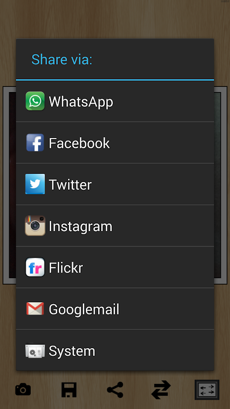 The created images can be switched or framed afterwards. Then you can share the result via facebook, twitter, instagram, flickr, email etc. with your friends.