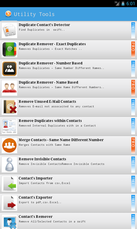 2. Duplicate Contacts Remover :(Pro Feature) Removes all above identified exact number duplicates & makes you contacts clean