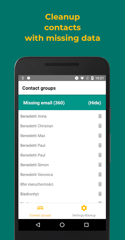 In case you want to cleanup contacts with missing phone numbers, missing emails or missing names, look no further. Duplicate contacts merger and remover will find such contacts with missing data and provide an easy way to delete them or fill in the missing parts. Want to just remove duplicate phone numbers or emails? With duplicate contacts remover such a cleanup task easy too!