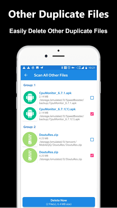 ● اسکین ملٹی فائل ٹائپ: بہت سی ڈپلیکیٹ فائلوں کو اسکین کرنا جیسے ڈپلیکیٹ فوٹوز، ڈپلیکیٹ آڈیوز، ڈپلیکیٹ ویڈیوز، ڈپلیکیٹ APK اور ڈپلیکیٹ دستاویزات وغیرہ۔