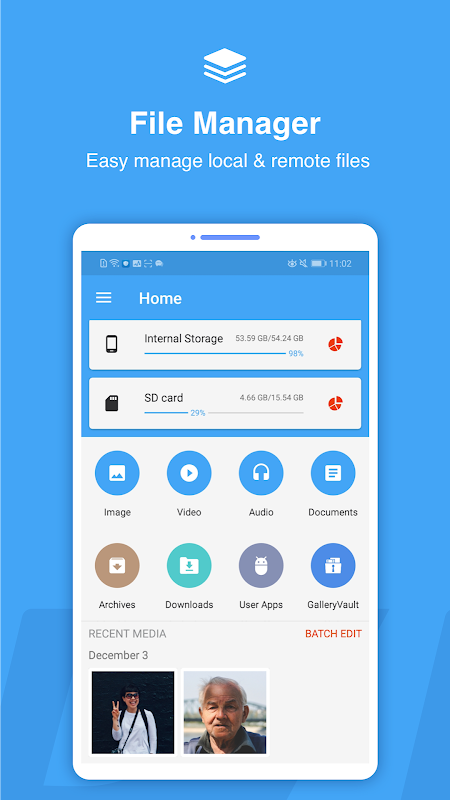 DV File Explorer helps you manage all your files whether they are stored in your device's memory, microSD card, local area network, and cloud storage accounts. By default, DV File Explorer allows you to copy, move, rename, delete or share files to and from any of your storages. It also lets you browse and access your files by category.