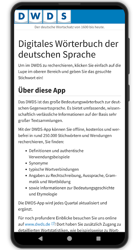 یہ ایپ پورٹل www.dwds.de کا آف لائن ورژن ہے، جہاں آپ الفاظ کے اعدادوشمار، تصویری اور آڈیو مواد، لغت اور ادارتی مضامین کے ساتھ ساتھ جامع ٹیکسٹ کارپورا اور دیگر لغات میں تحقیق بھی حاصل کر سکتے ہیں۔