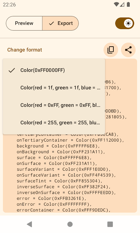 تمام ڈائنامک تھیم ویلیوز کو Material3 Compose ColorSchemes کے بطور کاپی کرنے کے لیے ایکسپورٹ ٹیب کا استعمال کریں۔
