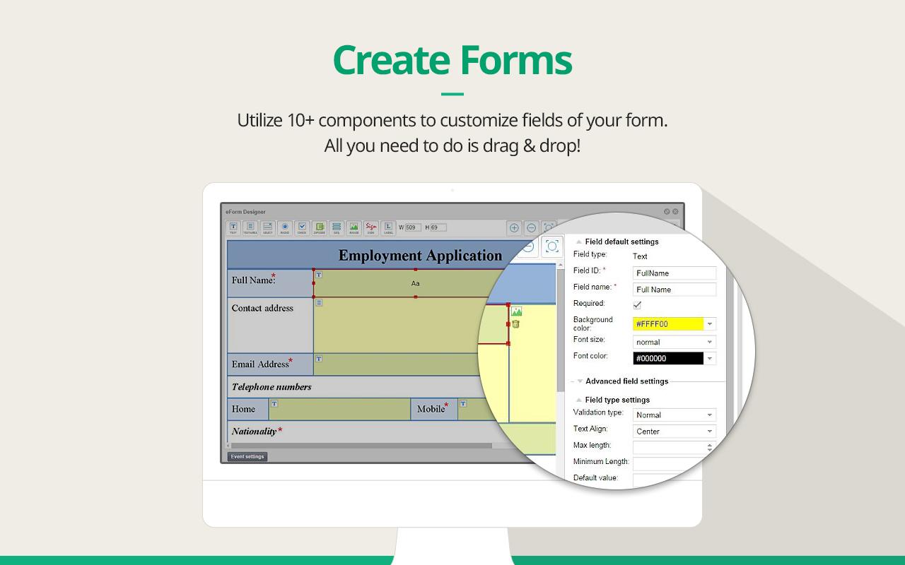 • Easy form generation with various input components such as text, signature, checkbox provided by a built-in form designer tool