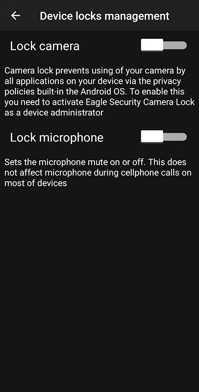 ایگل سیکیورٹی آپ کے فون پر کیمرہ اور/یا مائیکروفون کو غیر فعال کرنے کے لیے فعالیت بھی فراہم کرتی ہے تاکہ کسی بھی اسپائی ویئر کے لیے ان کا استعمال ناممکن ہو جائے جب آپ یہ یقینی بنانا چاہتے ہیں کہ آپ کا فون آپ کو نہیں سن رہا ہے اور نہ ہی دیکھ رہا ہے۔