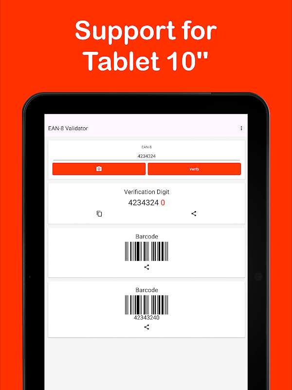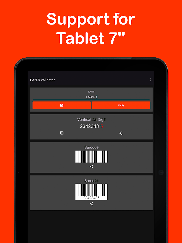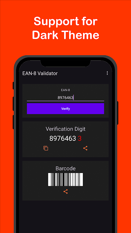بارکوڈ کی تصدیق کے لیے ایپلی کیشن استعمال کرنا بہت آسان ہے، بس اپنا EAN-8 بارکوڈ (8 ہندسوں) درج کریں اور اس کی معلومات دیکھنے کے لیے "تصدیق کریں" کے بٹن کو دبائیں، آپ کو تصدیقی ہندسہ حاصل ہو جائے گا (سرخ میں نمایاں کیا گیا ہے) اور آپ اسے کاپی یا شیئر کر سکتے ہیں۔ آپ کے EAN-8 بارکوڈ سے مماثل بارکوڈ بھی تیار کیا جائے گا، جسے آپ آسانی سے شیئر کر سکتے ہیں۔