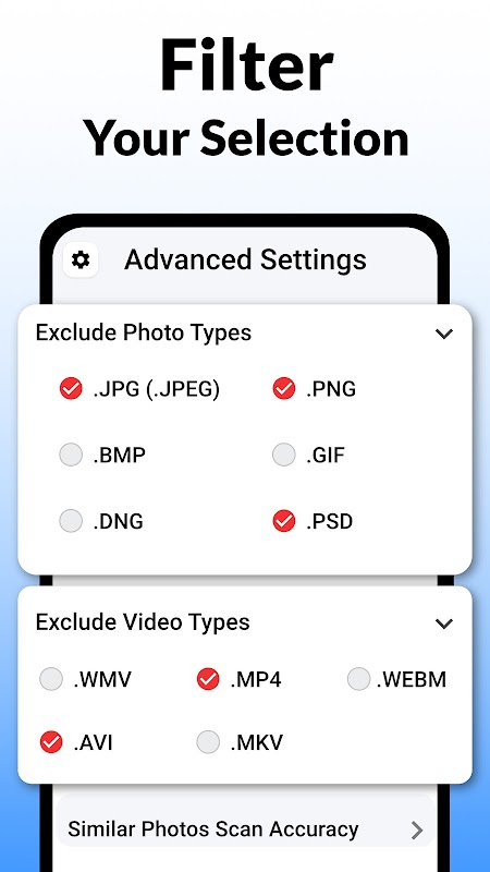 • لچکدار فائل کا انتخاب: مطلوبہ نتائج کے لیے اپنے تلاش کے پیرامیٹرز کو اسکین کرنے اور اپنی مرضی کے مطابق کرنے کے لیے فائل کی اقسام کا انتخاب کریں۔