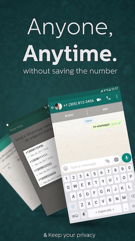 سب سے حیرت انگیز فری ایزیڈ ایپلی کیشن ایک android ڈاؤن لوڈ ، پلیٹ فارم پر جو آپ کے روابط میں نمبر شامل کیے بغیر واٹس ایپ میسج بھیجنے کے بہترین صارف کے تجربے کے ساتھ بہت آسان ہے۔