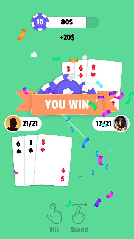 Hyper casual blackjack twenty one with One finger gameplay
