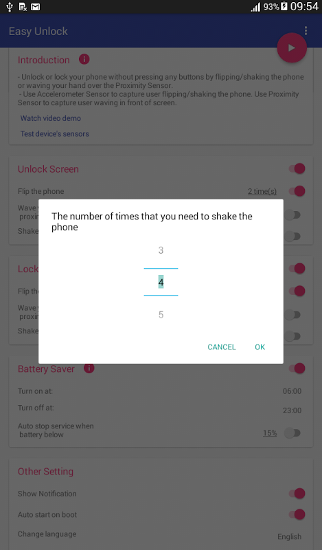 - اپنا فون ہلائیں ، آپ فون کو ہلانے کی ضرورت کی تعداد مقرر کرسکتے ہیں۔ پلٹائیں خصوصیت کی طرح ، جب صارف فون کو ہلاتا ہے تو ایزی انلاک صرف انلاک اسکرین کو۔