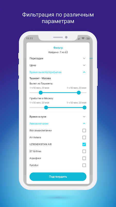 Пользователи могут воспользоваться фильтрами и выбрать авиабилет, подходящее по большому количеству разных параметров: классу, стоимости, продолжительности пути, по авиакомпаниям, времени прибытия, времени стыковки, а также система подскажет самый оптимальный вариант для полета.