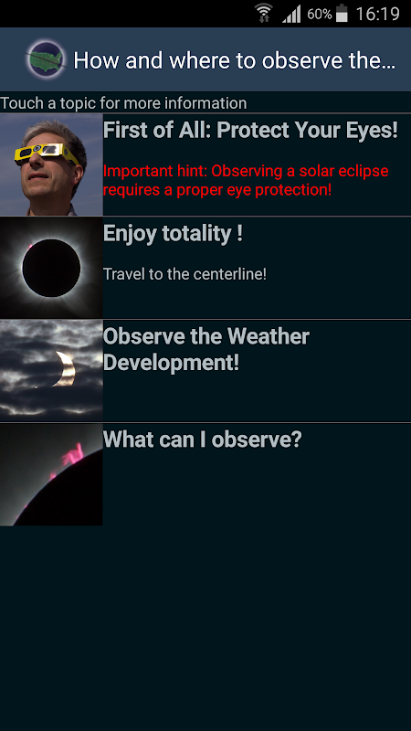 چاند گرہن کی یاد دلانے کے لیے آپ اپنے ذاتی اینڈرائیڈ کیلنڈر میں حسابی اوقات شامل کر سکتے ہیں۔ مینو سے آپ کو اپنے محل وقوع کے لیے موسم کی ممکنہ ویب سائٹس کے براہ راست روابط ملتے ہیں۔
