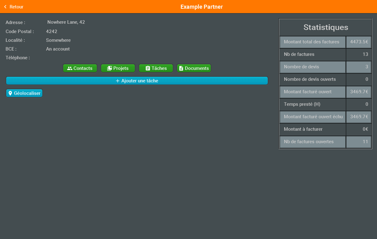 - Contactez vos partenaires par mail ou par téléphone d'un simple clic grâce au lien avec les applications dédiées de votre tablette ou de votre téléphone.