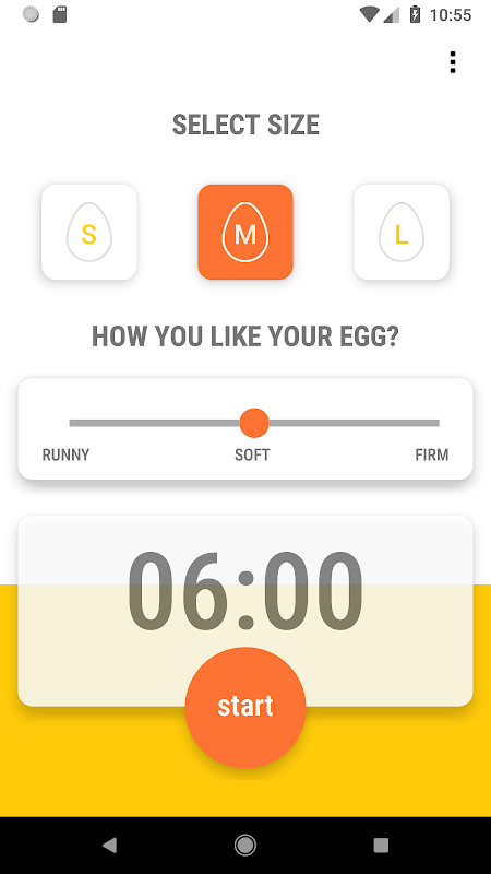انڈا ٹائمر آسان ایپ ہر وقت ایک کامل ابلا ہوا انڈا حاصل کریں۔ انڈے کا سائز منتخب کریں اور ترجیح اور اسٹارٹ منتخب کریں۔