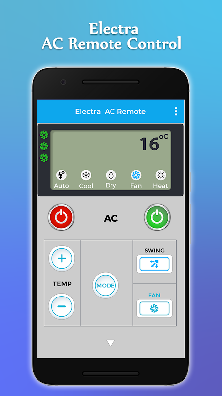 Launch freely Electra AC Remote Control app and start to change AC temperature with a mobile app. This app has all features like easily increase or decrease Temperature of AC, Change swing option, Change fan speed functions, or also change modes.