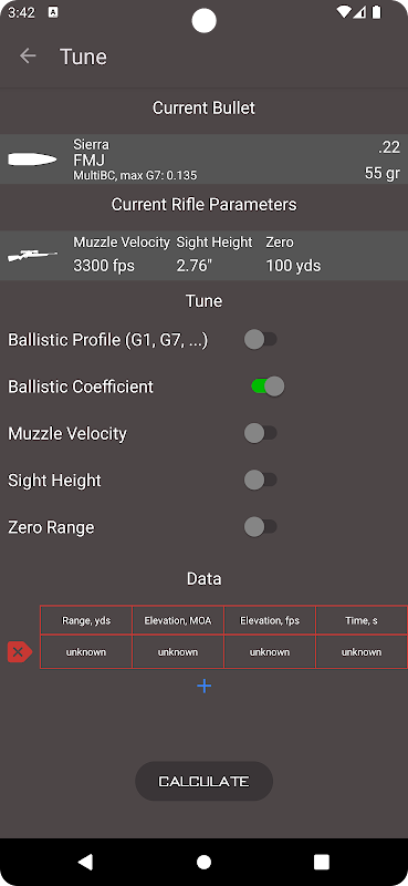 - "حقیقی" خصوصیت کا استعمال کرتے ہوئے BC، Muzzle Velocity اور مزید کیلیبریٹ کریں، اور متعدد ڈریگ فنکشنز (G1, G7, GA, RA4) میں سے انتخاب کریں۔