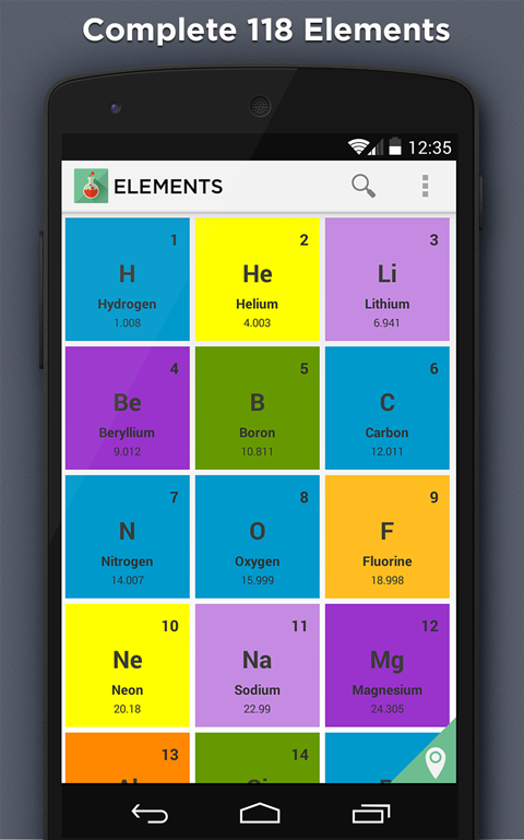 The Elements app contains detailed chemical and physical information of all chemical elements. The app comes with with dynamic layouts showing names, electrons, oxidation, trend visualization, orbitals, isotopes, search with element name etc.