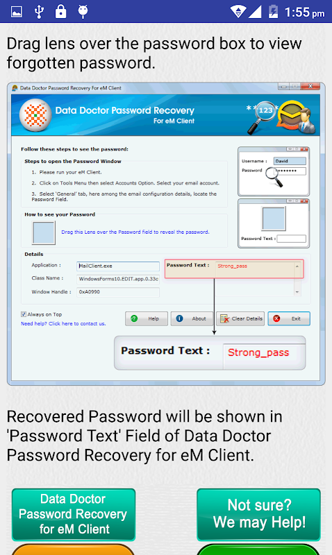 ایپ ونڈوز کے لئے متعلقہ ڈیٹا ڈاکٹر پاس ورڈ ریکوری سافٹ ویئر کا استعمال کرتے ہوئے نجمہ یا نقاط کے پیچھے پوشیدہ پاس ورڈ کو تبدیل کرنے کے لئے پاس ورڈ کو کھولنے اور انکشاف کرنے کے اقدامات کی صلاح دیتا ہے۔ ڈیٹا ڈاکٹر پاس ورڈ ریکوری سافٹ ویئر سے ہر قسم کی ای میلز کے محفوظ کردہ پاس ورڈز کا انکشاف ہوتا ہے جن میں تمام قسم کی ویب سائٹوں کے ای میلز کے ساتھ ساتھ مقبول ای میل سروسز جیسے جی میل ہاٹ میل آؤٹ لک یاہو اے او ایل وغیرہ سے قطع نظر آپ SSL پر پی او پی 3 ایس ایم ٹی پی یا آئی ایم اے پی پر مبنی ترتیبات تشکیل دیتے ہیں۔ TSL یا معیاری توثیق کی ترتیبات۔