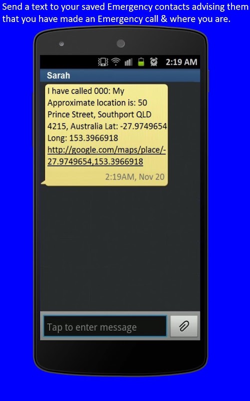 ★ Once the user has completed the call to Triple-Zero (000), State Emergency Service (SES) or Police Non-Emergency the app has the added benefit (if you wish to use it) of transmitting a Text message to two saved emergency contacts advising them that an Emergency call has been made including the address, longitude and latitude.