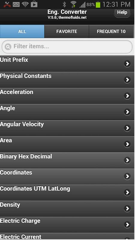 Choose a category such as length, energy, entropy, electric charge, etc., from a list. The available units appear in two spinning wheels. Spin the wheels to select 'From Unit' and 'To Unit'. That is it. You can change the input value in the yellow field, sort units, or use the swap button. Additional info about a measure is displayed when the help button is pressed.